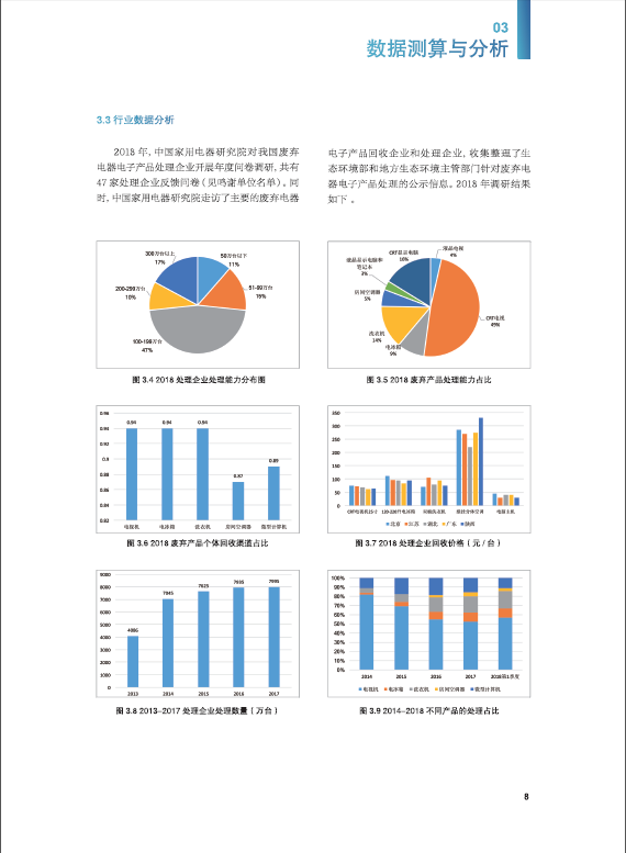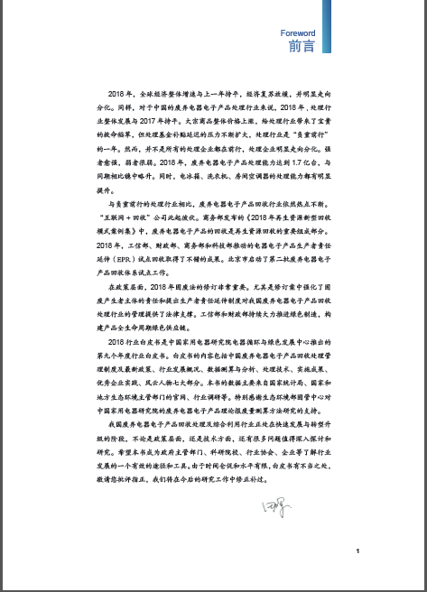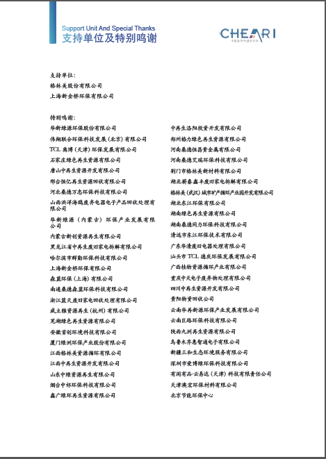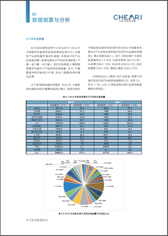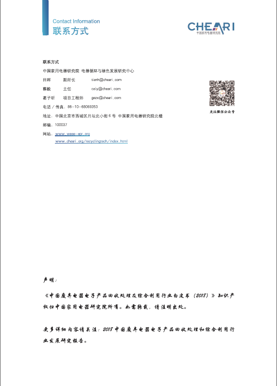 中国家用电器研究院从1998年开始一直为我国废弃电器电子产品回收处理管理政策提供行业技术支持,积累了丰富的专业知识和行业信息。2018行业白皮书是中国家用电器研究院电器循环与绿色发展研究中心推出的第九个年度行业白皮书,2018年行业白皮书的数据来自2018年至2019年初,中国家用电器研究院电器循环与绿色发展研究中心开展的最新行业现场调研与问卷调查。
